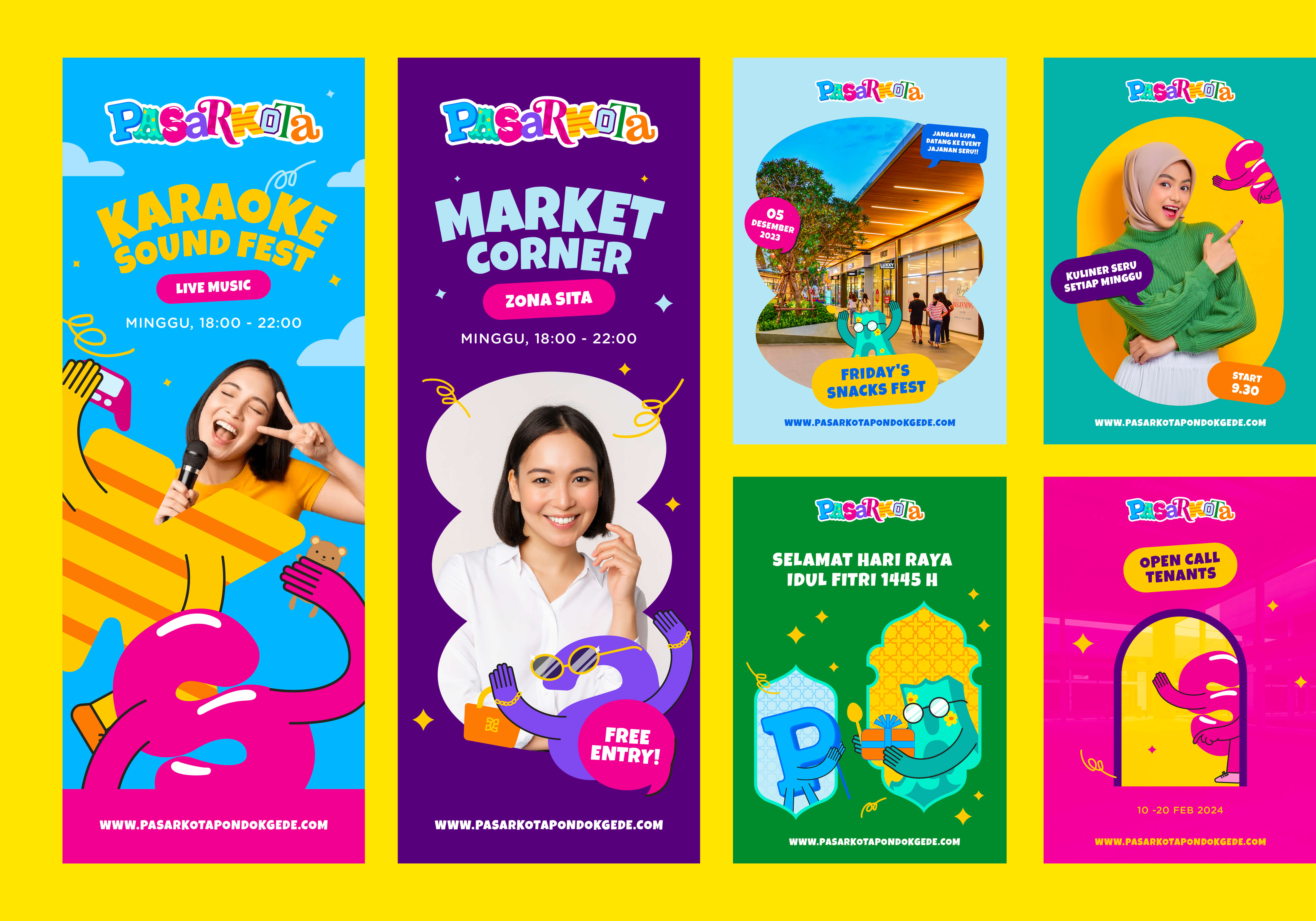 PasarKota required an identity that could speak to a wide audience — families, students, young professionals — while still feeling modern, joyful, and instantly recognizable. With the destination hosting retail, F&B, and entertainment, the brand needed to flex across signage, mascots, events, and digital communication without losing coherence. We began by studying Pondok Gede’s demographics, behaviors, and community patterns to understand how people move, gather, and engage in the area.